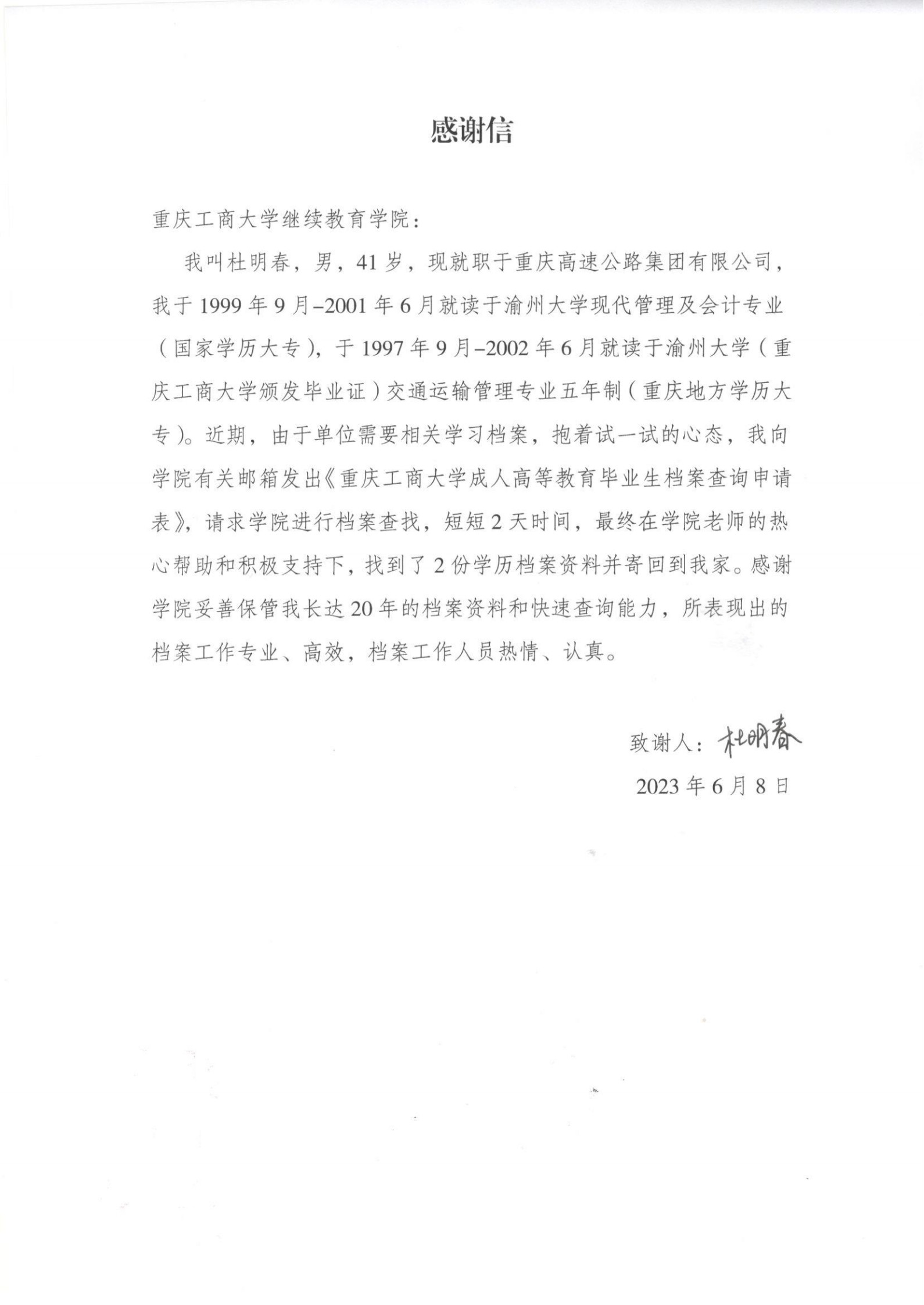 2023年6月8日,伟德国际bevictor1946收到一份感谢信,这封信件来自公司2002级员工杜明春,信中表达了他对伟德国际bevictor1946老师帮助其查找档案并邮寄档案的感激之情。