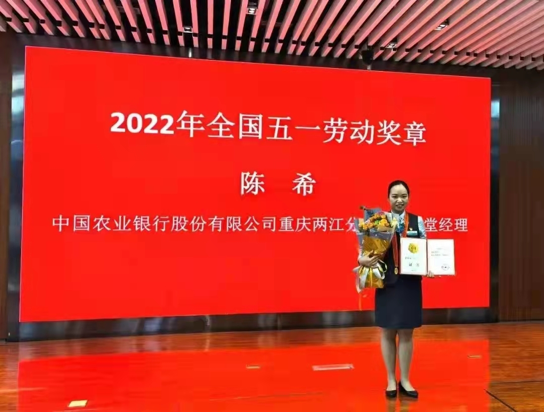 陈希现任农行重庆两江分行营业部高级大堂经理,总行级优秀内训师,陈希劳模创新工作室负责人。从事金融行业工作17年来,时刻践行“我是农行人,农行是我家,一言一行树农行形象,一心一意为客户服务”的信念,用心用情用爱做好每项工作。她独创暖心便民服务包,为客户提供个性化细致周到服务;成功阻止2起针对聋哑人的网络诈骗,涉及金额20余万元;成功协助解救被困传销组织少女1起;开展线上线下微课堂,为群众普及金融知识,参与人次达80余万人;他利用休息时间编写《大堂知识汇编及实习生服务规范》,在全市农行范围推广;充分利用陈希劳模创新工作室开展金融惠民服务,2021年工作室团队发放普惠贷款68笔,金额6903万元,助力小微企业纾困和恢复生产,目前该工作室已经成为农行重庆分行的一张靓丽名片,被人民网、新华网重庆频道等重要媒体广泛宣传报道。由于工作业绩突出,她先后荣获“2017年度中国银行业文明规范服务‘明星大堂经理’之‘优秀明星大堂经理’”、“2018年重庆市金融五一劳动奖章”、“2019年全国金融五一劳动奖章”、“2022年全国五一劳动奖章”等荣誉称号。
